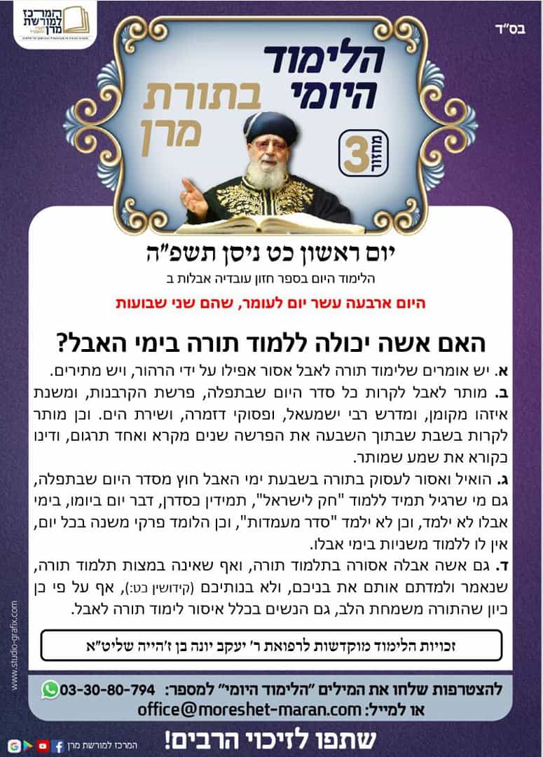 היום נלמד האם אשה יכולה ללמוד תורה בימי האבל?
