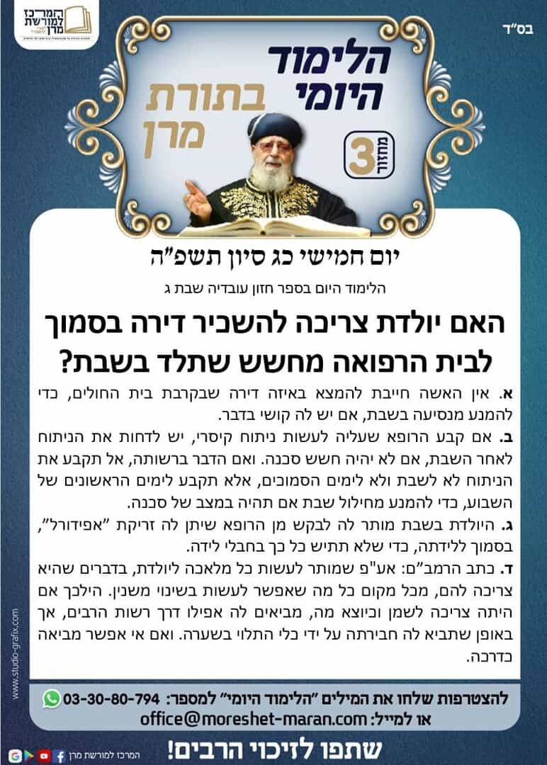 היום נלמד האם יולדת צריכה לשכור דירה בסמוך לבית הרפואה מחשש שתלד בשבת?