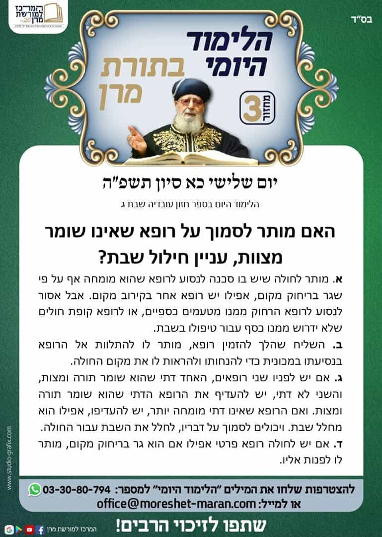 היום נלמד האם מותר לסמוך על רופא שאינו שומר מצוות, עניין חילול שבת?