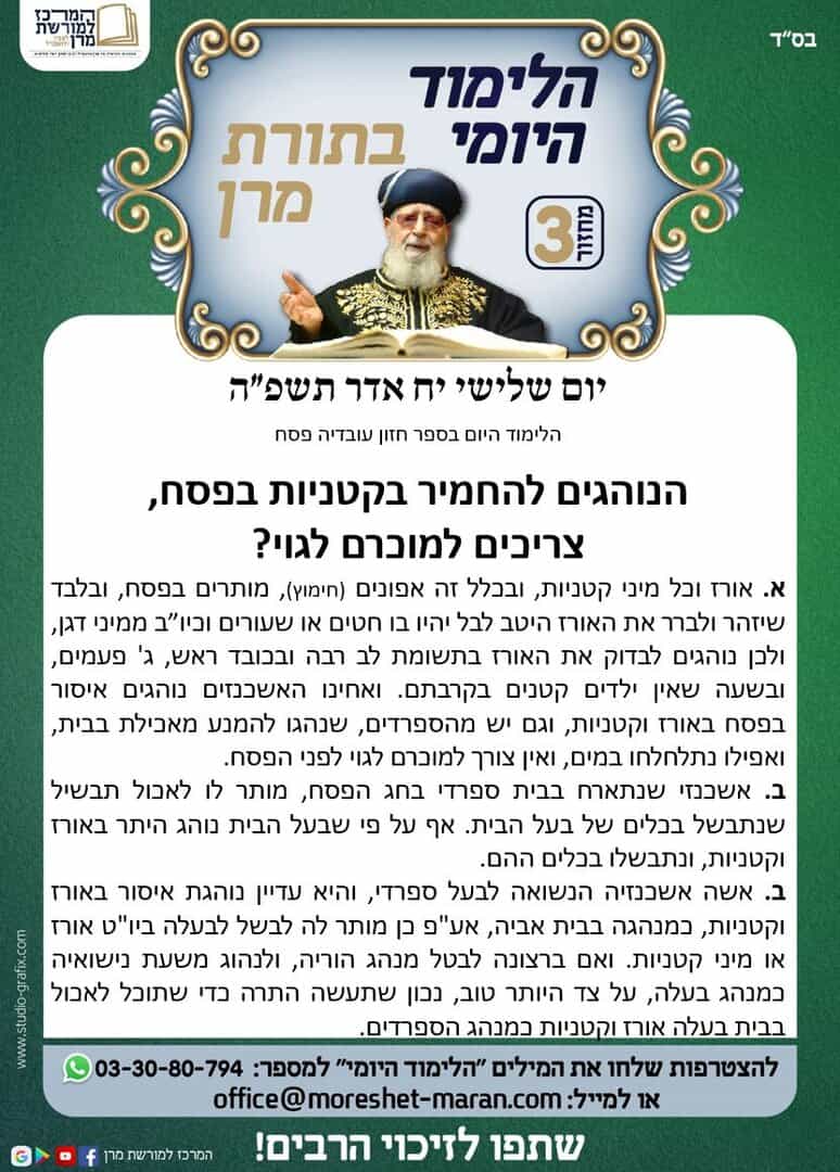 היום נלמד הנוהגים להחמיר בקטניות בפסח, צריכים למוכרם לגוי?