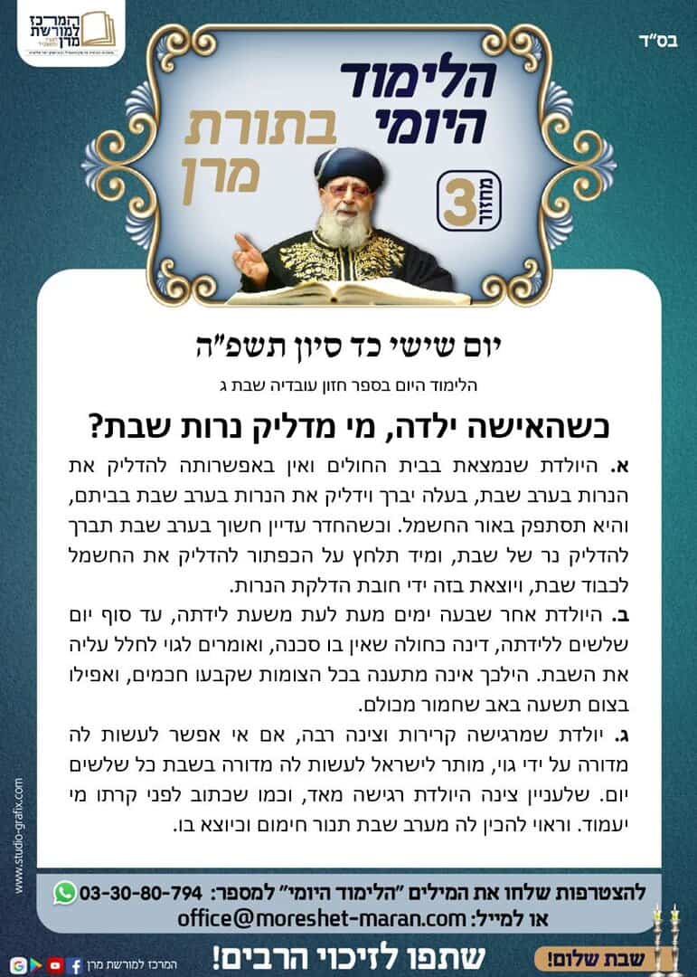 כשהאישה ילדה, מי מדליק נרות שבת? הלימוד היומי בתורת מרן