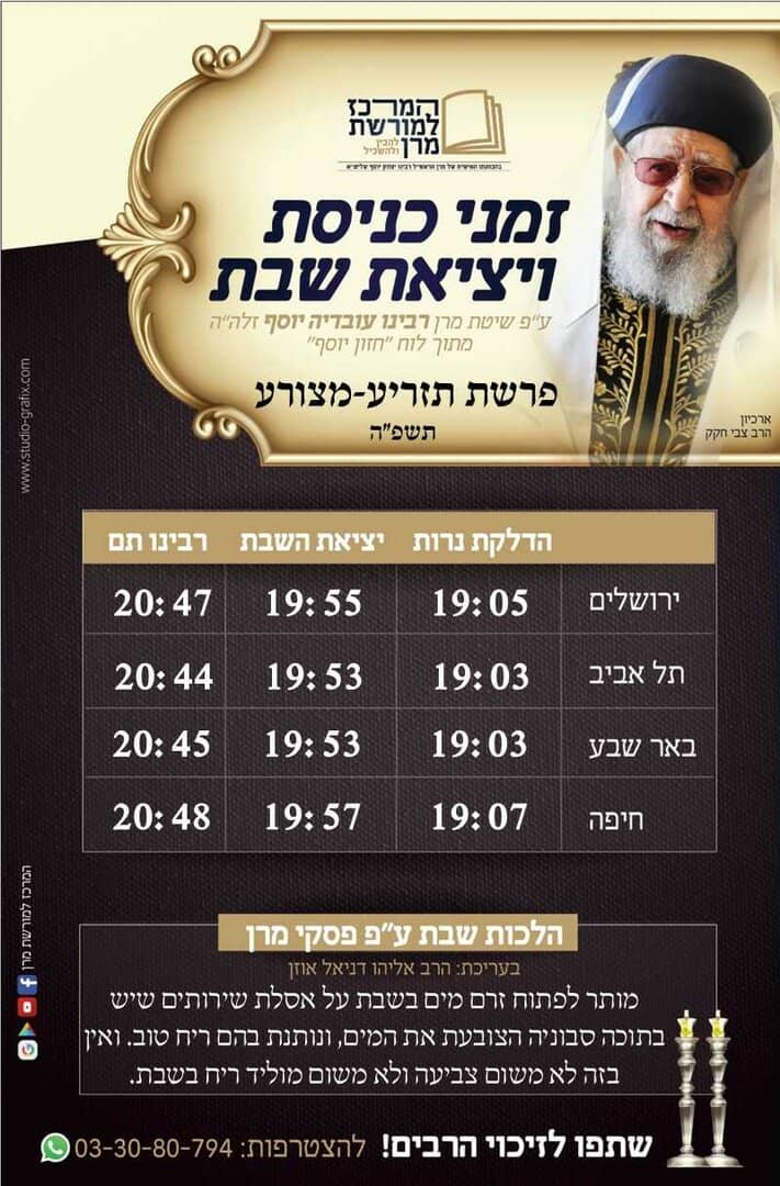 זמני כניסת ויציאת השבת על פי פסקי מרן הרב עובדיה יוסף זיע"א מתוך הלוח "חזון יוסף".