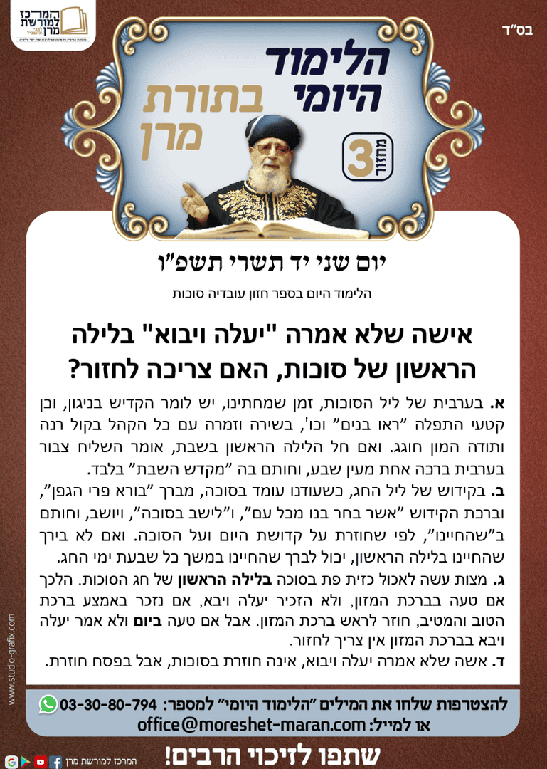 היום נלמד אישה שלא אמרה "יעלה ויבוא" בלילה הראשון של סוכות, האם צריכה לחזור?