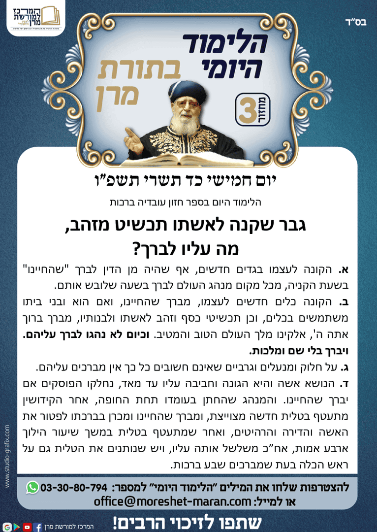 היום נלמד גבר שקנה לאשתו תכשיט מזהב, מה עליו לברך?
