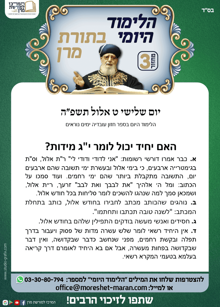 "הלימוד היומי בתורת מרן" נלמד מידי יום ע"י עשרות אלפים ברחבי הארץ והעולם, הצטרפו ללימוד של היום – יום שלישי ט' אלול ה'תשפ"ה