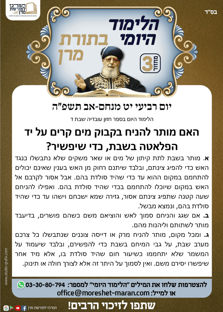 האם מותר להניח בקבוק מים קרים על יד הפלאטה בשבת, כדי שיפשיר? | הלימוד היומי בתורת מרן