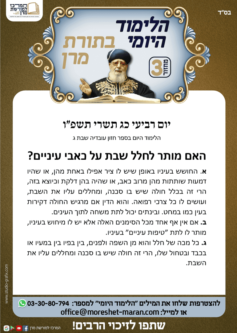 האם מותר לחלל שבת על כאבי עיניים? | הלימוד היומי בתורת מרן