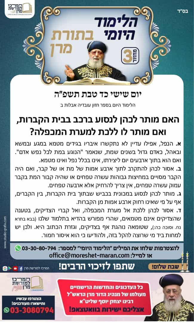 היום נלמד האם מותר לכהן לנסוע ברכב בבית הקברות, ואם מותר לו ללכת למערת המכפלה?
