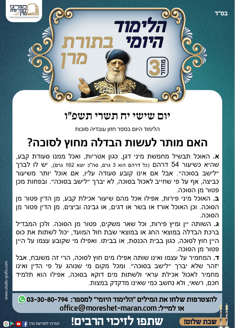 האם מותר לעשות הבדלה מחוץ לסוכה? | הלימוד היומי בתורת מרן