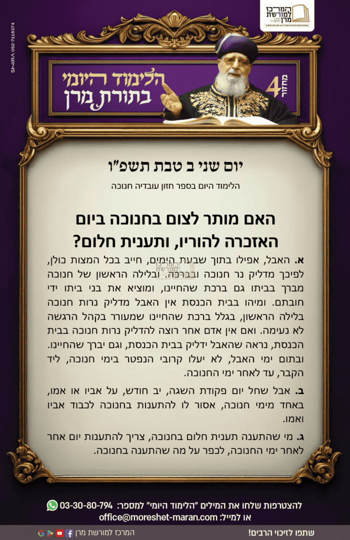 היום נלמד האם מותר לצום בחנוכה ביום האזכרה להוריו, ותענית חלום?