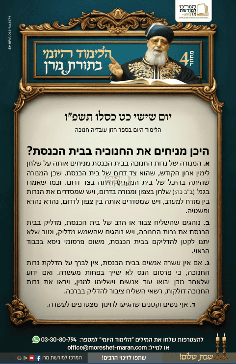 היכן מניחים את החנוכיה בבית הכנסת? | הלימוד היומי בתורת מרן