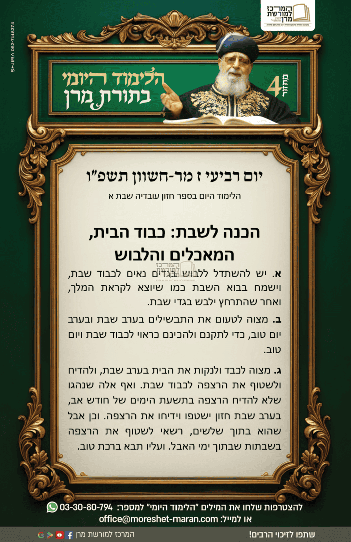 "הלימוד היומי בתורת מרן" הנלמד מידי יום ע"י עשרות אלפים ברחבי הארץ והעולם, הצטרפו ללימוד של היום – יום רביעי ז' מר-חשוון ה'תשפ"ו