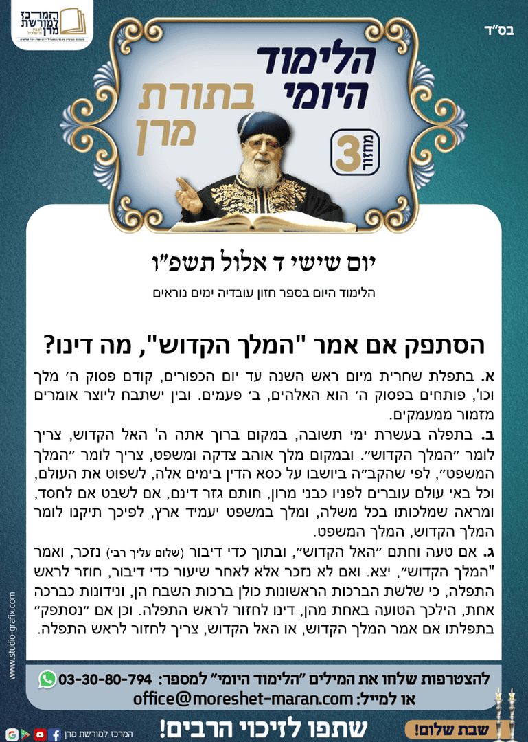 "הלימוד היומי בתורת מרן" נלמד מידי יום ע"י עשרות אלפים ברחבי הארץ והעולם, הצטרפו ללימוד של היום – יום השישי ד' תשרי ה'תשפ"ו