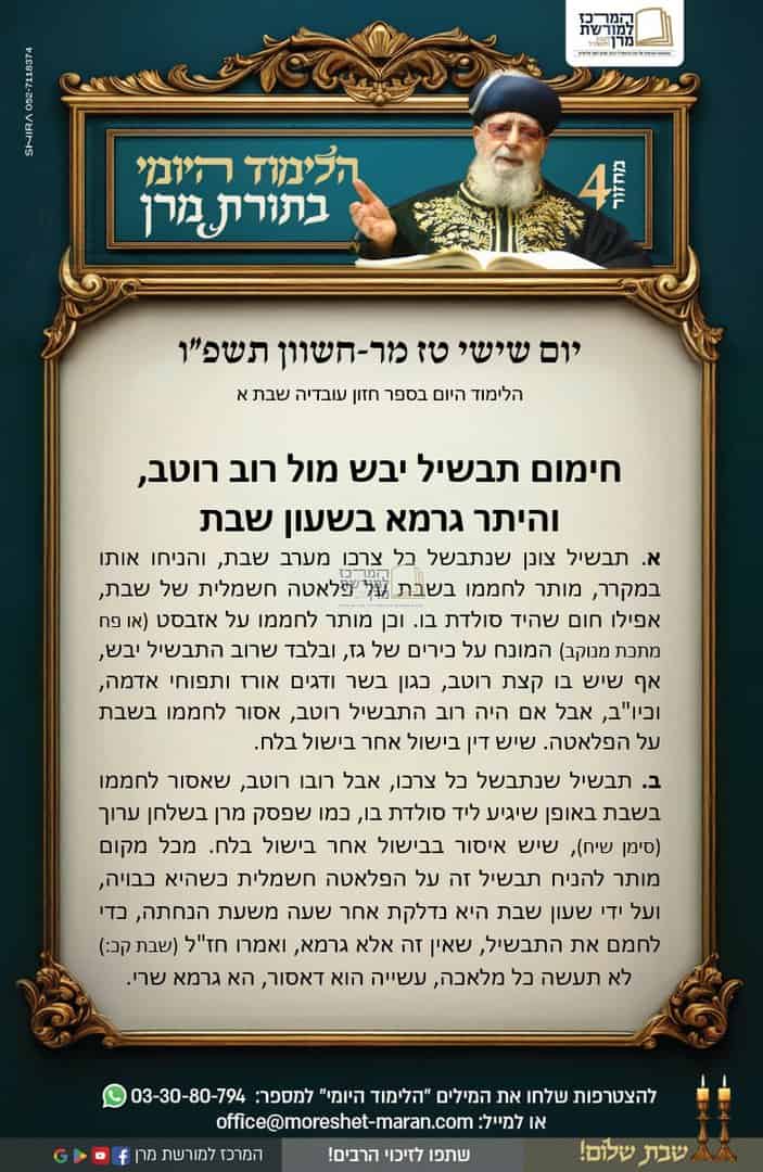 "הלימוד היומי בתורת מרן" הנלמד מידי יום ע"י עשרות אלפים ברחבי הארץ והעולם, הצטרפו ללימוד של היום – יום הששי ט"ז מר-חשוון ה'תשפ"ו