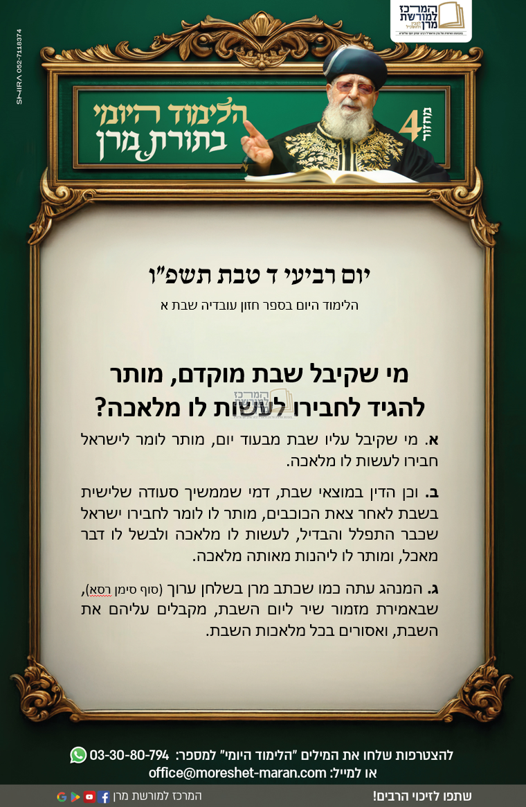 "הלימוד היומי בתורת מרן" הנלמד מידי יום ע"י עשרות אלפים ברחבי הארץ והעולם, הצטרפו ללימוד של היום – יום רביעי ד' טבת ה'תשפ"ו