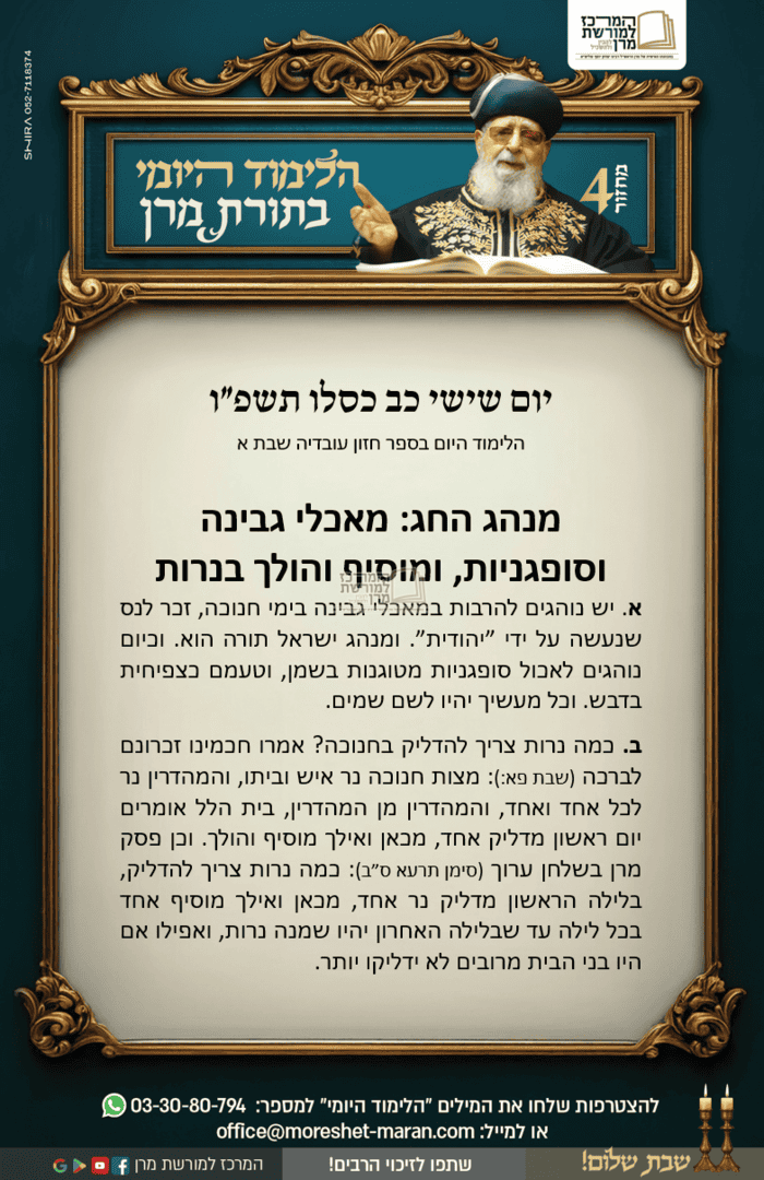 היום נלמד מנהג החג: מאכלי גבינה וסופגניות, ומוסיף והולך בנרות