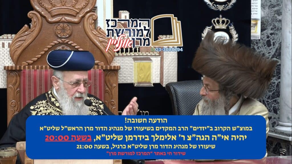 במוצאי שבת הקרוב, פרשת וישב תשפ"ה, יגיע לבית הכנסת "היזדים" בירושלים מגיד המישרים הגאון הצדיק רבי אלימלך בידרמן שליט"א לשמש כרב המקדים בשיעורו השבועי הגדול בתבל של מנהיג הדור מרן הראשון לציון רבינו יצחק יוסף שליט"א. שיעורו של הרב המקדים הרב בידרמן יוקדם בחצי שעה, ויחל אי"ה בשעה 20:00 ושיעורו של מרן שליט"א כרגיל, בשעה […]