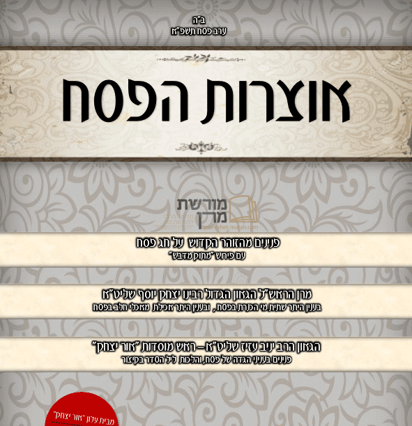 מוסדות "אור יצחק" בעוד חוברת נפלאה לקראת חג הפסח ! "אוצרות הפסח" פניני זוהר הקדוש: על חג הפסח, עם פירוש "מתוק מדבש" מרן הראש"ל רבינו יצחק יוסף שליט"א: בענין שתיית מי הכנרת בפסח, בענין היתר שתית חלב בפסח הגאון הרב יניב עזיז שליט"א: דרשות בעניני החג סדר ליל הסדר להורדה חינם: לחץ כאן