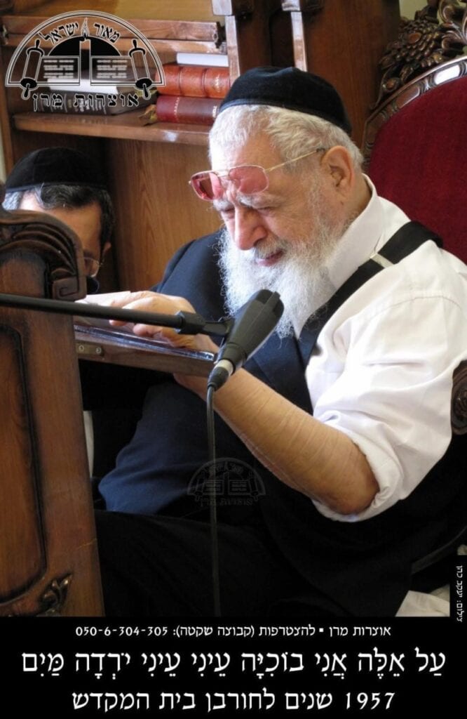 מי שלא ראה בדורנו את מרן רבינו הגדול זצוקללה"ה מבכה על חרבן בית המקדש, לא חש מימיו חורבן בית המקדש! בכל שנה בשיעורו השבועי ערב תשעה באב, כאשר היה נושא הלכות ומנהגי והשתלשלות החורבן, היה בוכה בדמעות שליש, ומקונן בצער רב על חורבן המקדש. כל מי שזכה לישב בצילו ולהתחמם מאור תורתו, בראותו את רבינו […]