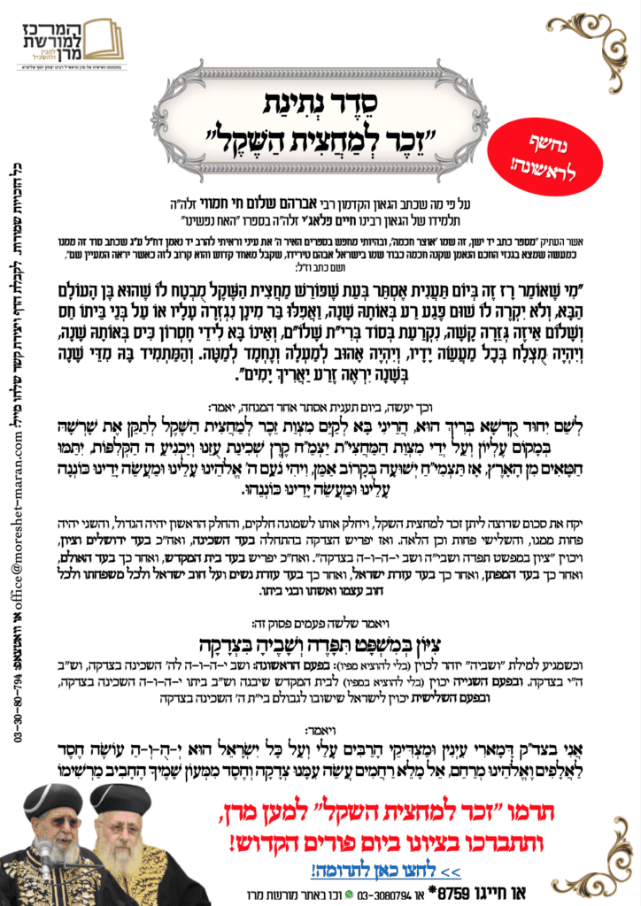 לאחר דורות שהיה ספון, נחשף לראשונה ״סדר נתינת זכר למחצית השקל״ אשר מסוגל לישועות רבות!