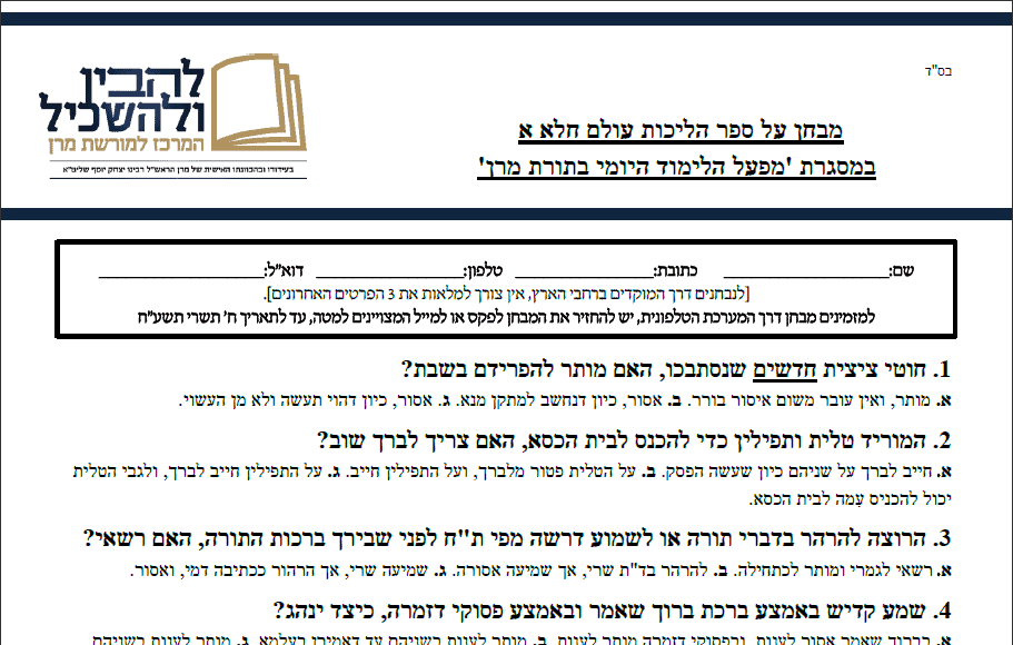 היום, יום שני כז אלול תשע"ז, מתקיים מבחן על כל ספר "הליכות עולם" חלק א, במסגרת מפעל "הלימוד היומי בתורת מרן". בכל יום נלמדים 4 הלכות מתורתו של מרן רבינו עובדיה יוסף זלה"ה, ובסיום כל ספר מתקיים מבחן (אמריקאי). להורדת המבחן לחץ כאן. לאחר סימן התשובות יש לסרוק את המבחן ולשלחו לכתובת: או לפקס: 02-9929972 […]