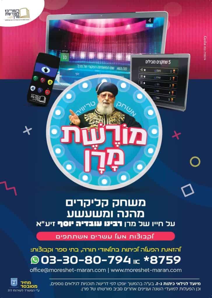 ״המרכז למורשת מרן – להבין ולהשכיל״ שמח להציג עוד פרויקט נפלא: משחק טריוויה ״מורשת מרן״, אשר מטרתו להנציח עוד ועוד את דמותו, תורתו ומורשתו של מרן רבינו עובדיה יוסף זיע״א, וכעת פרויקט נפלא הפונה לילדים, וגם למבוגרים שנהנים:) משחק קליקרים עם שלטים, המיועד לכיתות בתלמודי התורה ובבתי הספר וכן לקבוצות שונות (מינימום 20 משתתפים), בו […]