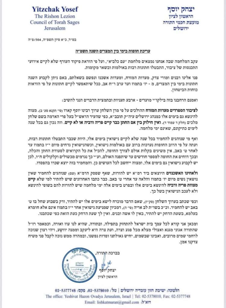 הקלה הלכתית בימי המלחמה: מנהיג הדור מרן הראש"ל רבנו יצחק יוסף שליט״א, פרסם מכתב הלכתי מיוחד בו הוא מתיר לערוך חתונות בימי בין המצרים גם לבני עדות אשכנז. במכתב מסביר מרן מנהיג הדור שליט״א כי מדובר בשעת דחק קשה, בשל ביטולי חתונות עקב המצב הביטחוני והמחסור באולמות פנויים לאחר תשעה באב. לדבריו, "המחמיר בזה יוצא […]