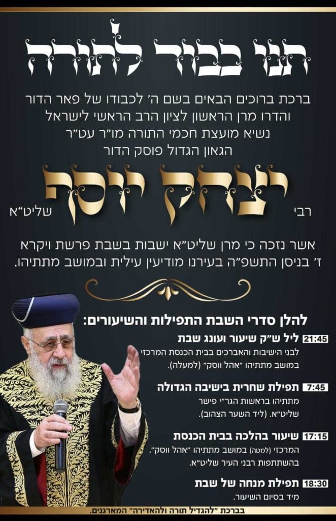 תושבי והסביבה מתתיהו מתרגשים לקראת שבת מיוחדת ונדירה – שבת ויקרא הגדול מוקדם, בה יתארח מנהיג הדור מרן הראשון לציון רבנו יצחק יוסף שליט"א. שבת זו, מביאה עמה הזדמנות נדירה לשאוב מתורתו של אחד מגדולי פוסקי הדור ולחוות חוויית שבת רוחנית ועוצמתית. במהלך השבת יתקיימו תפילות ושיעורים מיוחדים, שבהם יזכה הציבור לשמוע דברי תורה מפי […]