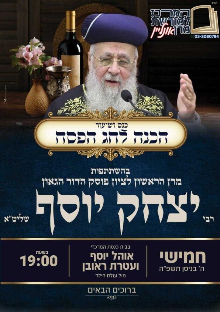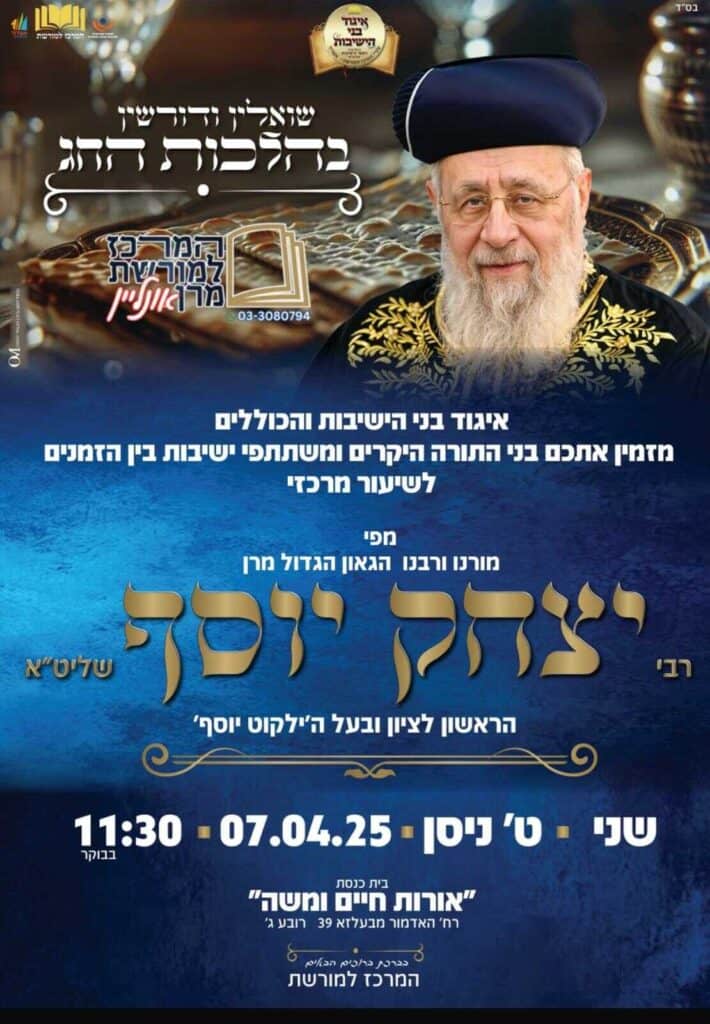 שואלין ודורשין: שיעור בהלכה לקראת חג הפסח בעיר אשדוד, בראשות מנהיג הדור מרן הראשון לציון רבנו יצחק יוסף שליט"א