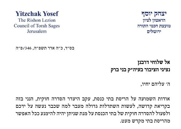 בני ברק: מנהיג הדור מרן הראשון לציון רבנו יצחק יוסף שליט"א שלח מכתב חיזוק בעקבות הריסת בתי הכנסת בעיר