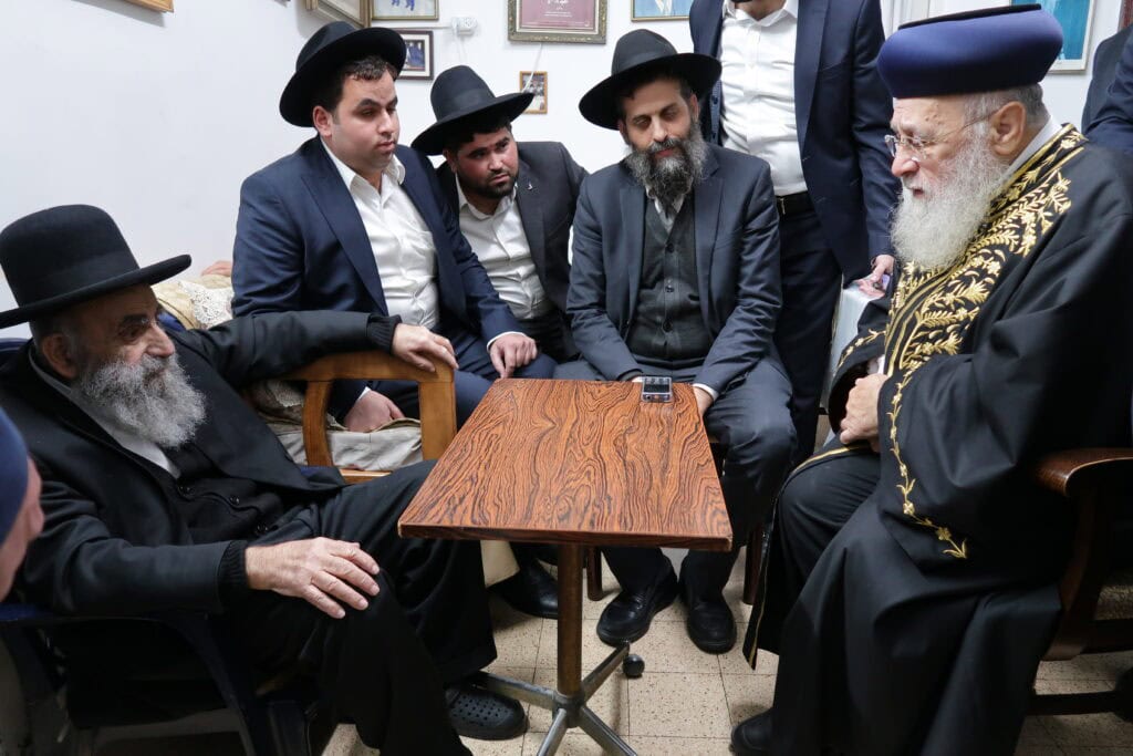 מרן פוסק הדור הראש"ל הגאון רבי יצחק יוסף שליט"א עלה לנחם את מרן רה"י הגאון רבי משה צדקה שליט"א על פטירת אחיו הרב שאול צדקה זצ"ל. צילום: ש.פ.ה