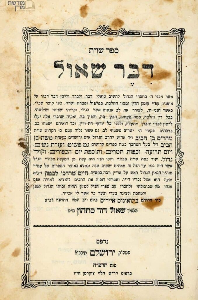 היום י"ט בסיוון יום פטירתו של חכם שאול סתהון (דבח) זיע"א (ה'תרי"א – י"ט בסיוון ה'תר"ץ) היה רב העיר עינתאב שבסוריה, דיין בחלב והרב הראשי לקהילות היהודיות של יוצאי סוריה בבואנוס איירס שבארגנטינה, ומחבר הספר דבר שאול – שו"ת על ארבעת חלקי השולחן ערוך. הרב נולד בחלב שבסוריה בשנת ה'תרי"א (1851) לרב דוד סתהון. בילדותו התייתם […]