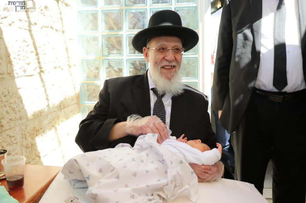 מורנו ראש ישיבת פורת יוסף חכם שלום הכהן בסנדקאות בברית שנערכה בביתו
