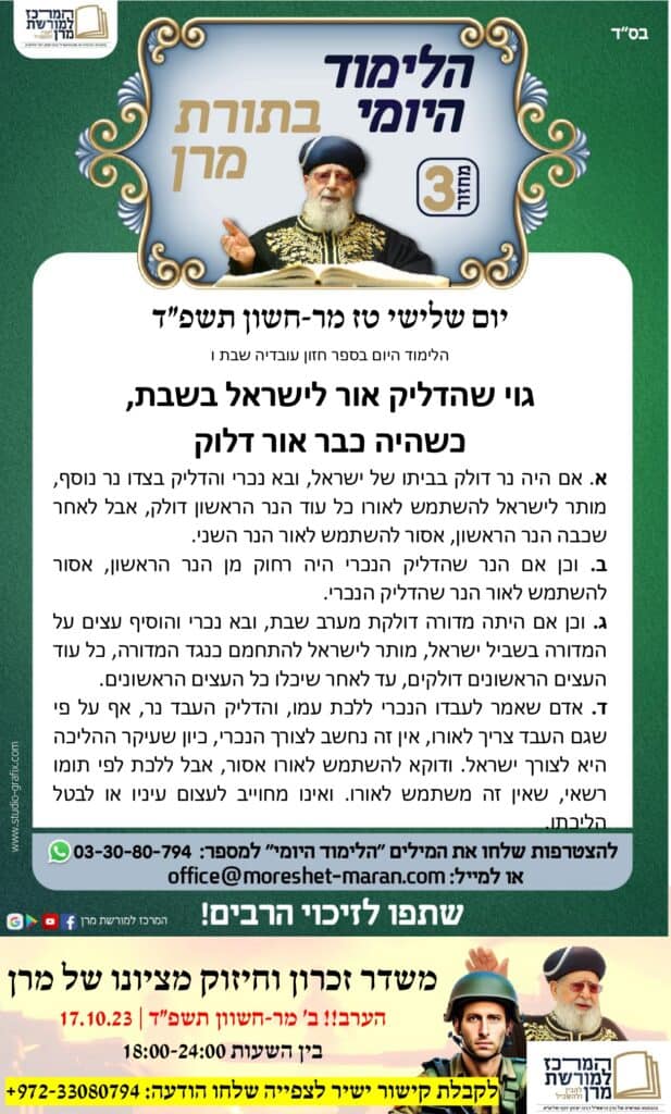 היום נלמד גוי שהדליק אור לישראל בשבת, כשהיה כבר אור דלוק א. אם היה נר דולק בביתו של ישראל, ובא נכרי והדליק בצדו נר נוסף, מותר לישראל להשתמש לאורו כל עוד הנר הראשון דולק, אבל לאחר שכבה הנר הראשון, אסור להשתמש לאור הנר השני. ב. וכן אם הנר שהדליק הנכרי היה רחוק מן הנר הראשון, […]