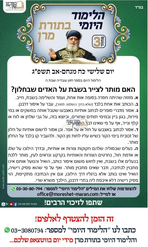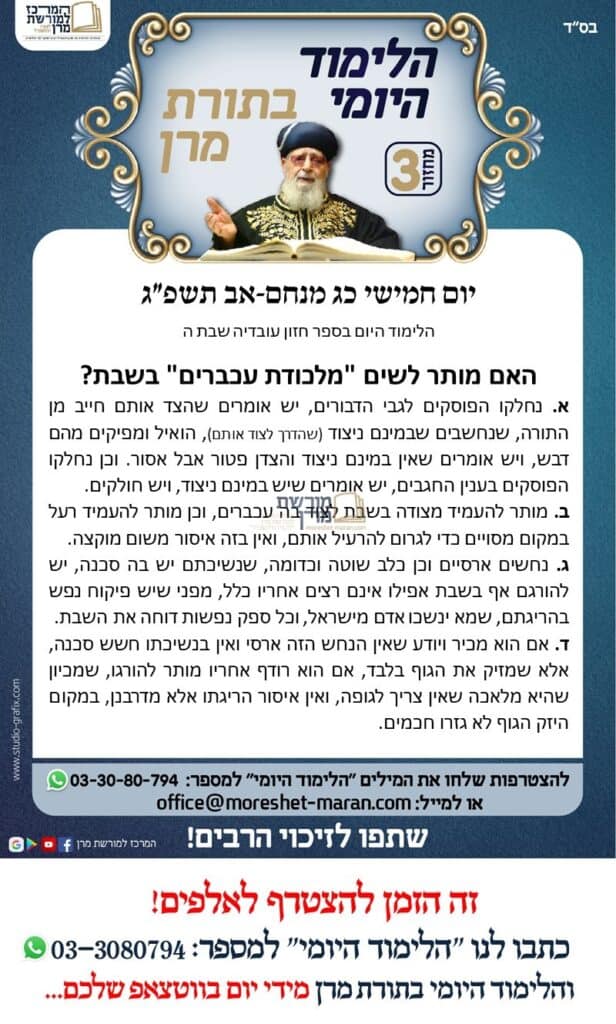 המליצו למשפחה ולחברים להצטרף ללימוד היומי בתורתו של מרן! *להצטרפות לחצו כאן* *היום נלמד האם מותר להאזין לחדשות הפועלות בשבת?* א. סיגריות שמודפס על הנייר שלהן אותיות, מותר לעשן אותן ביום טוב. ואף על פי שהאותיות נמחקות ונשרפות אין לחוש משום איסור מוחק ביום טוב. ב. אסור להשמיע קול בכלי שיר בשבת, גזרה שמא יתקן […]