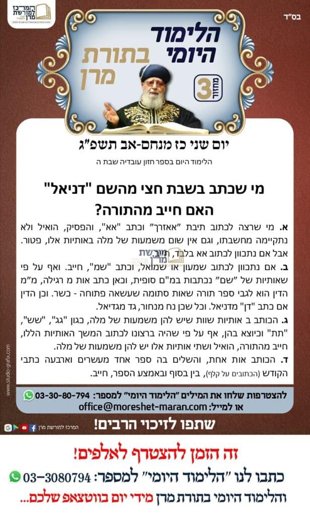 המליצו למשפחה ולחברים להצטרף ללימוד היומי בתורתו של מרן! *להצטרפות לחצו כאן* *היום נלמד מי שכתב בשבת חצי מהשם "דניאל" האם חייב מהתורה?* א. מי שרצה לכתוב תיבת ״אאזרך״ וכתב "אא", והפסיק, הואיל ולא נתקיימה מחשבתו, וגם אין שום משמעות של מלה באותיות אלו, פטור. אבל אם נתכוון לכתוב אא בלבד, חייב. ב. אם נתכוון […]