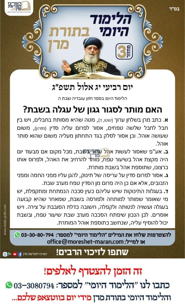 המליצו למשפחה ולחברים להצטרף ללימוד היומי בתורתו של מרן! *להצטרפות לחצו כאן* *היום נלמד האם מותר לסגור גגון של עגלה בשבת?* א. כתב מרן בשלחן ערוך (שטו, ד), מטה שהיא מסותת בחבלים, ויש בין חבל לחבל שלשה טפחים, אסור לפרום עליה סדין (מזרון), משום שעושה אוהל. וכן אסור לסלק בגד התחתון מעליה משום שהוא סותר […]