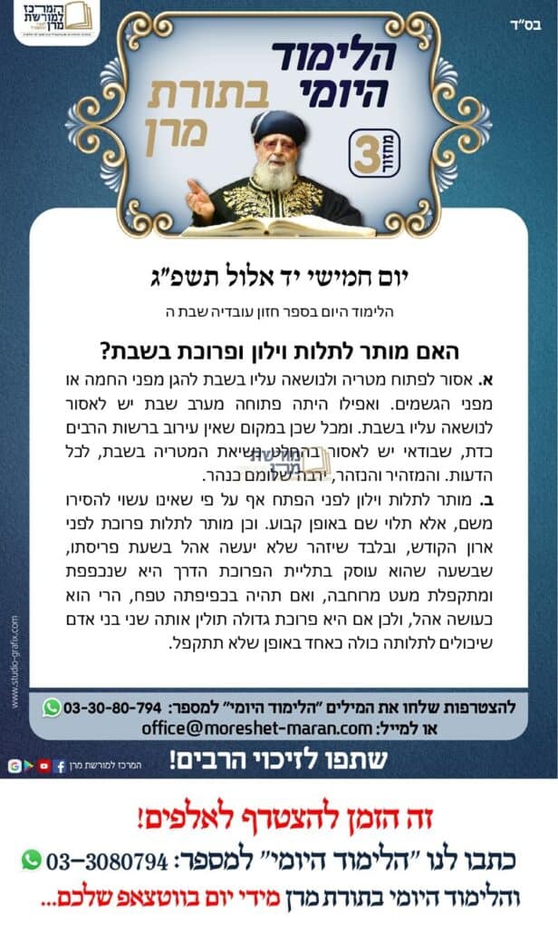 המליצו למשפחה ולחברים להצטרף ללימוד היומי בתורתו של מרן! *להצטרפות לחצו כאן* *היום נלמד האם מותר לתלות וילון ופרוכת בשבת?* א. אסור לפתוח מטריה ולנושאה עליו בשבת להגן מפני החמה או מפני הגשמים. ואפילו היתה פתוחה מערב שבת יש לאסור לנושאה עליו בשבת. ומכל שכן במקום שאין עירוב ברשות הרבים כדת, שבודאי יש לאסור בהחלט […]