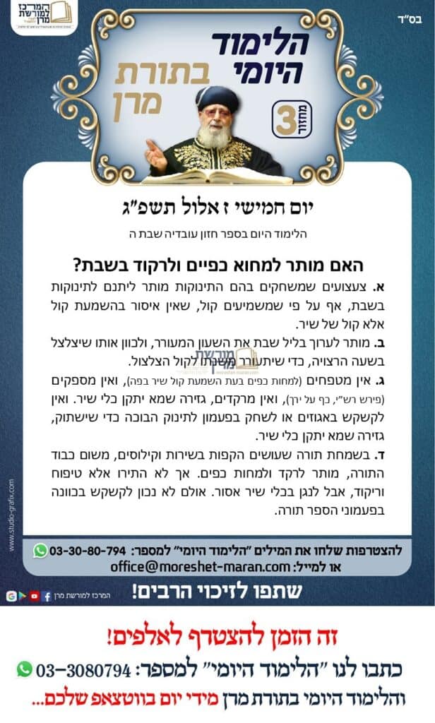 המליצו למשפחה ולחברים להצטרף ללימוד היומי בתורתו של מרן! *להצטרפות לחצו כאן* *היום נלמד האם מותר למחוא כפיים ולרקוד בשבת?* א. צעצועים שמשחקים בהם התינוקות מותר ליתנם לתינוקות בשבת, אף על פי שמשמיעים קול, שאין איסור בהשמעת קול אלא קול של שיר. ב. מותר לערוך בליל שבת את השעון המעורר, ולכוון אותו שיצלצל בשעה הרצויה, […]