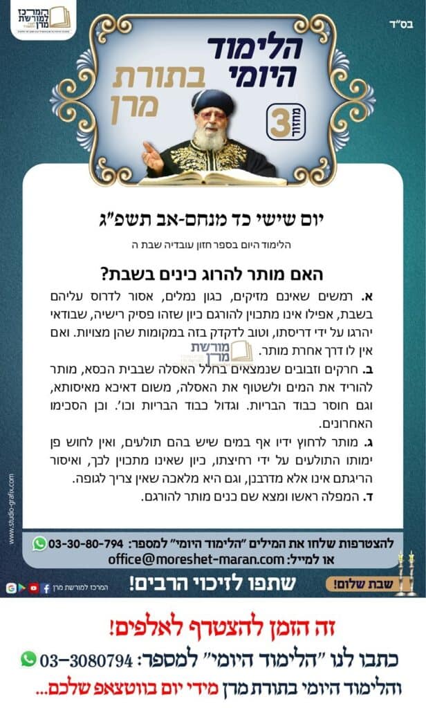 המליצו למשפחה ולחברים להצטרף ללימוד היומי בתורתו של מרן! *להצטרפות לחצו כאן* *היום נלמד האם מותר להרוג כינים בשבת?* א. רמשים שאינם מזיקים, כגון נמלים, אסור לדרוס עליהם בשבת, אפילו אינו מתכוין להורגם כיון שזהו פסיק רישיה, שבודאי יהרגו על ידי דריסתו, וטוב לדקדק בזה במקומות שהן מצויות. ואם אין לו דרך אחרת מותר. ב. […]