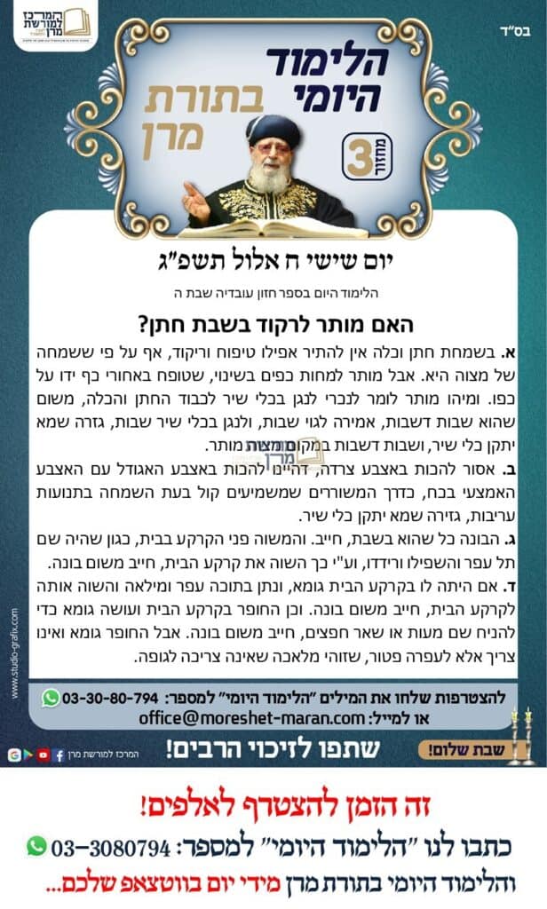 המליצו למשפחה ולחברים להצטרף ללימוד היומי בתורתו של מרן! *להצטרפות לחצו כאן* *היום נלמד האם מותר לרקוד בשבת חתן?* א. בשמחת חתן וכלה אין להתיר אפילו טיפוח וריקוד, אף על פי ששמחה של מצוה היא. אבל מותר למחות כפים בשינוי, שטופח באחורי כף ידו על כפו. ומיהו מותר לומר לנכרי לנגן בכלי שיר לכבוד החתן […]
