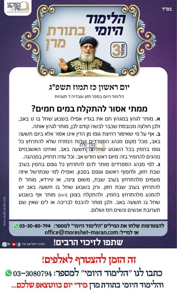 המליצו למשפחה ולחברים להצטרף ללימוד היומי בתורתו של מרן! *להצטרפות לחצו כאן* *היום נלמד ממתי אסור להתקלח במים חמים?* א. מותר לגהץ במגהץ חם את בגדיו אפילו בשבוע שחל בו ט באב, ולכן חולצה מכובסת שכבר לבשה קודם לכן, מותר לגהץ אותה. ב. אף על פי שאיסור רחיצת גופו מן הדין אינו אסור אלא ביום […]