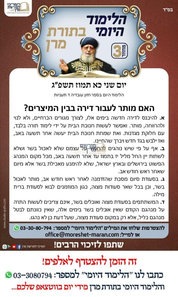 המליצו למשפחה ולחברים להצטרף ללימוד היומי בתורתו של מרן! *להצטרפות לחצו כאן* https://chat.whatsapp.com/CkImGJYP62CAhLBBsfTzeh *היום נלמד האם מותר לעבור דירה בבין המיצרים?* א. להיכנס לדירה חדשה בימים אלו, לצורך מגורים הכרחיים, ולא לנוי ולהרווחה, מותר. ואפשר לעשות חנוכת הבית על ידי לימוד תורה בלבד, עם חלוקת מגדנות. ואת שמחת חנוכת הבית יעשה אחר תשעה באב, ואז […]