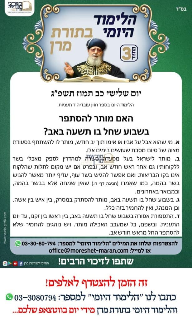 המליצו למשפחה ולחברים להצטרף ללימוד היומי בתורתו של מרן! *להצטרפות לחצו כאן* *היום נלמד האם מותר להסתפר שבוע שחל בו תשעה באב?* א. מי שהוא אבל על אביו או אימו תוך יב חודש, מותר לו להשתתף בסעודת מצוה של סיום מסכת שעושים בימים אלו. ב. מותר לישראל בעל מסעדה כשרה למהדרין לספק מאכלי בשר ללקוחותיו […]