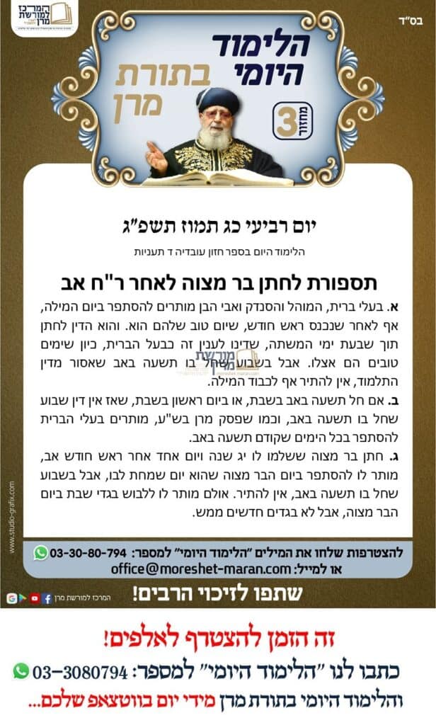 המליצו למשפחה ולחברים להצטרף ללימוד היומי בתורתו של מרן! *להצטרפות לחצו כאן* *היום נלמד האם מותר לחתן בר מצוה להסתפר לאחר ר"ח אב?* א. בעלי ברית, המוהל והסנדק ואבי הבן מותרים להסתפר ביום המילה, אף לאחר שנכנס ראש חודש, שיום טוב שלהם הוא. והוא הדין לחתן תוך שבעת ימי המשתה, שדינו לענין זה כבעל הברית, […]