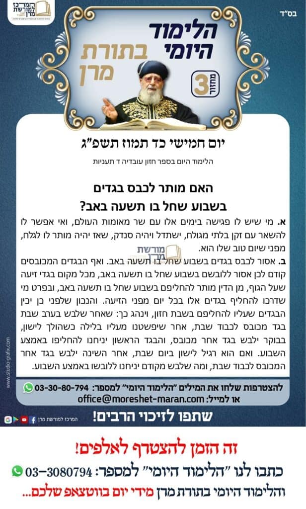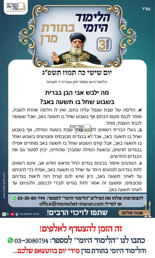המליצו למשפחה ולחברים להצטרף ללימוד היומי בתורתו של מרן! *להצטרפות לחצו כאן* *היום נלמד מה ילבש אבי הבן בברית בשבוע שחל בו תשעה באב?* א. חליפה של שבת שנפל עליה כתם, ואין לו חליפה אחרת לשבת, מותר לכבס מקום הכתם אף בשבוע שחל בו תשעה באב, שכל שעושה לכבוד השבת, מותר. ב. בעלי הברית רשאים […]