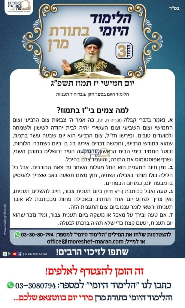 המליצו למשפחה ולחברים להצטרף ללימוד היומי בתורתו של מרן! *להצטרפות לחצו כאן* https://chat.whatsapp.com/CkImGJYP62CAhLBBsfTzeh *היום נלמד למה צמים בי"ז בתמוז?* א. נאמר בדברי קבלה (זכריה ח, יט), כה אמר ה׳ צבאות צום הרביעי וצום החמישי וצום השביעי וצום העשירי יהיה לבית יהודה לששון ולשמחה ולמועדים טובים. ופירשו חז״ל, צום הרביעי הוא יום שבעה עשר בתמוז, שהוא […]