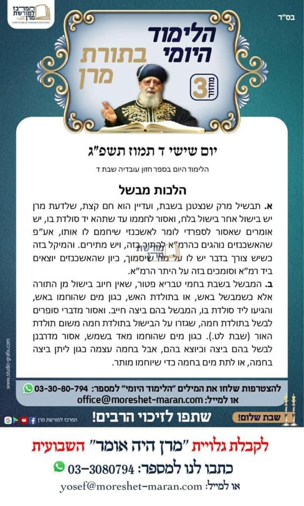 היום נלמד הלכות לש א. כוסות וקערות שעלו מן הרחצה, ויש עליהן טיפות מים צוננים, אף על פי כן מותר לערות עליהן בשבת מים חמים מכלי ראשון, שאין עירוי מכלי ראשון מבשל, לענין שבת, ועוד טעמים. ב. אחינו האשכנזים נוהגים כדעת הרמ״א וסיעתו להתיר לערות מים רותחים בשבת אל תוך התבשיל שנצטמק, לאחר שהורד מעל […]