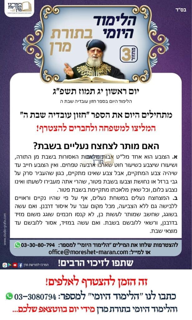 מתחילים היום את הספר "חזון עובדיה שבת ה" המליצו למשפחה ולחברים להצטרף ללימוד היומי בתורתו של מרן! *להצטרפות לחצו כאן* https://chat.whatsapp.com/CkImGJYP62CAhLBBsfTzeh האם מותר לצחצח נעליים בשבת? א. הצובע הוא אחד מל״ט אבות מלאכות האסורות בשבת מן התורה, ושיעורו שיצבע כשיעור חוט שארכו ארבעה טפחים. ואין הצובע חייב עד שיהיה צבע המתקיים, אבל צבע שאינו מתקיים, […]