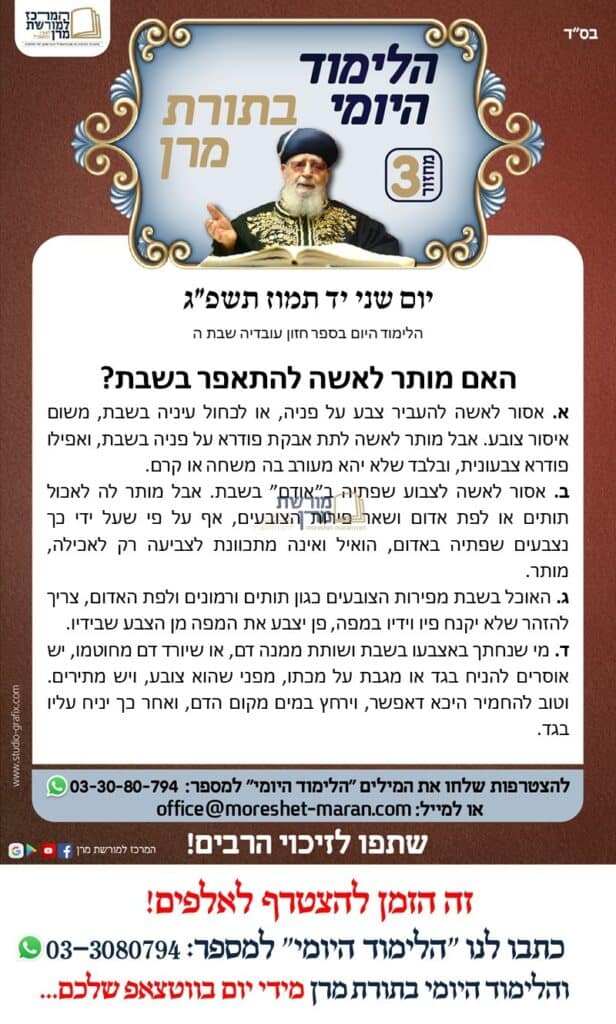 המליצו למשפחה ולחברים להצטרף ללימוד היומי בתורתו של מרן! להצטרפות לחצו כאן https://chat.whatsapp.com/CkImGJYP62CAhLBBsfTzeh *היום נלמד האם מותר לאשה להתאפר בשבת?* א. אסור לאשה להעביר צבע על פניה, או לכחול עיניה בשבת, משום איסור צובע. אבל מותר לאשה לתת אבקת פודרא על פניה בשבת, ואפילו פודרא צבעונית, ובלבד שלא יהא מעורב בה משחה או קרם. ב. […]